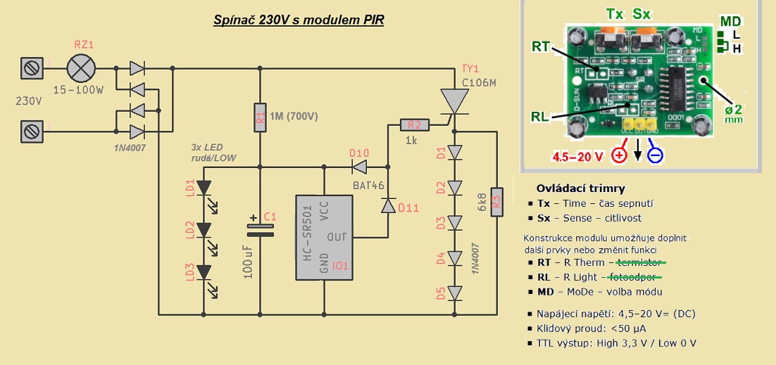 Jedná se o hybridní konstrukci, kde je jako pohybový senzor PIR použit známý modul HC-SR501 a jako aktor, tedy výkonový spínač, tyristor v D-můstku. Napájení obvodu v klidovém stavu zajišťuje předřadný R1 s akumulačním C1. Stabilizaci napětí kolem 4,5V na C1 zajišťují LED diody LD1,2,3. V aktivním, tedy zapnutém stavu je obvod napájen z elektrody G tyristoru TY1 přes R2 a D10. Zdvihací diody D1-D5 (+ přechod G) pak zajišťují napětí na C1 okolo 4-4,5V (závisle na proudu RZ). Při aktivaci PIRu přejde výstup OUT z úrovně L do úrovně H a sepne tyristor. Dále se pak výstup OUT uplatňuje už jen v síťové nule, kdy drží "spínací" napětí na elektrodě G tyristoru. Po nastaveném čase (R-trimr) přejde OUT do L, čímž se tyristor vypne (v původním zapojení bez D11). Na výstupu PIR/OUT je signál H/L úrovně TTL. Aby se TY1 sepnul úrovní H/3V, je nutné snížit součet blokovacích napětí diod D1-5, což zajišťuje rezistor R3. Obvod nemá funkci soumraku (nebylo třeba), ale na modulu HC-SR501 jsou k dispozici PADy pro připájení fotočidla.
