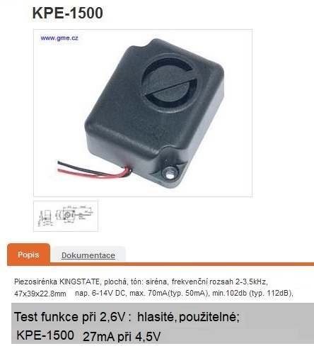 Dioda 1N5819 má malé dopředné napětí a relativně velký závěrný proud. Díky tomu se "časovací" C1 po výstřelu vybíjí na 1,2V (0,9V na TLV431) a zpětně nabíjí přes D1 na plné napětí +UN, takže T1 je plně uzavřen. Pro krátké pípnutí vyhověl kerko 680nF, pro čas 3-5sec ellyt max. 5uF - bo zde není omezovací R. Pro laserterč se dobře osvědčil obvod TLV431. Na aBay byl za pusu zakoupen balíček 50ks (TLV431-B). Tento obvod je nesrovnatelně lepší a využitelnější jak TL431 (viz datašít). Na výstupu darlingtonu T1 byla otestována sirénka KPE-1500 a Superpískátko. Obě samovybuzovací pieza jsou dostatečně hlasitá v interiéru, ve volném venkovním prostředí je to už horší. Přes omezovací R3 lze připojit nějakou indikační LED. Na DPS pro F-LED je třeba přemostit pozici C2, vynechat D2.