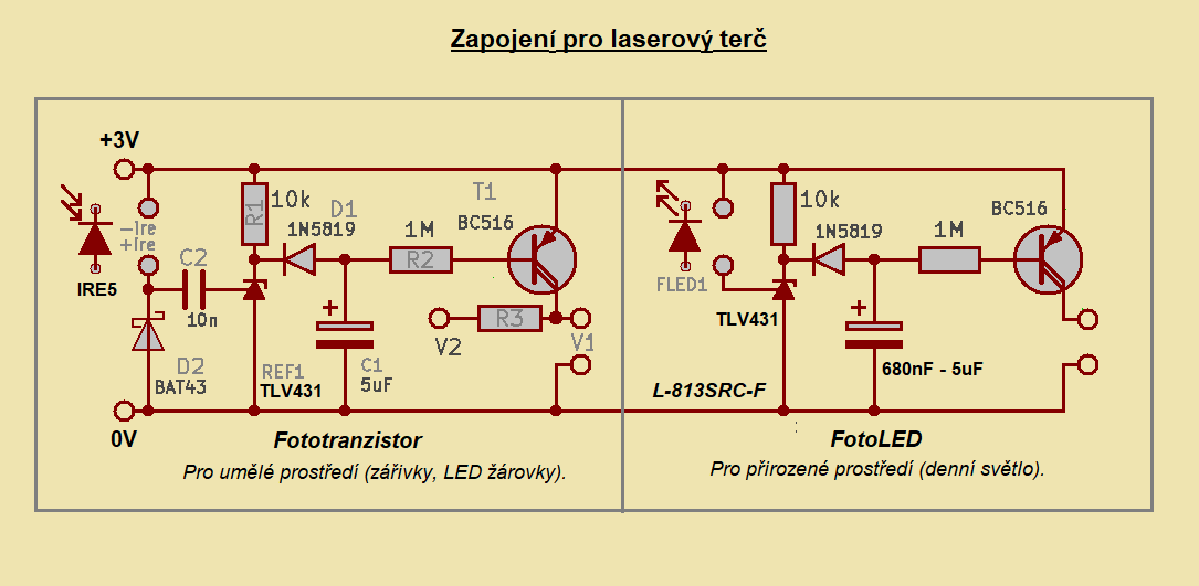 Tohle zapojení lze použít díky extrémně malému leak proudu LED závěrně. Obvod je vysoce necitlivý na denní i umělé světlo. Výhoda/nevýhoda: je to bodový terč 10mm - bo je třeba přímo trefit čočku F-LED, tedy vhodné pro "desítku" terče. Působí zde záporná zp. vazba, proto je třeba silný laserový impuls. LED lze zapojit k TLV431 i mezi piny Ref a Gnd, ale takhle je obvod citlivější, protože vygenerovaný napěťový impuls F-LED je v sérii s napájecím napětím. Při +UN 3V bude max. impuls na RZ 2,1V (0,9V na TLC431). Místo LED lze zapojit IRE5 závěrně, pak ale obvod ztratí imunitu na denní světlo.